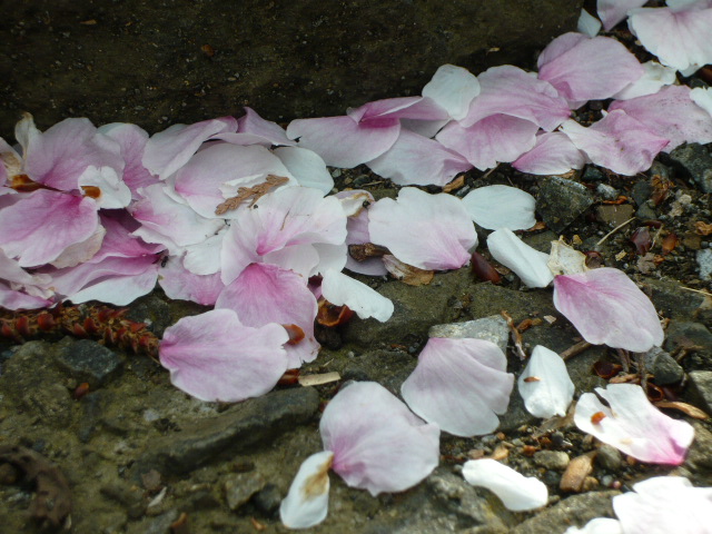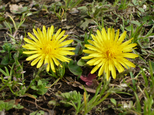 落ちてもまだ濃いピンク♪    短いタンポポが当たり一面♪