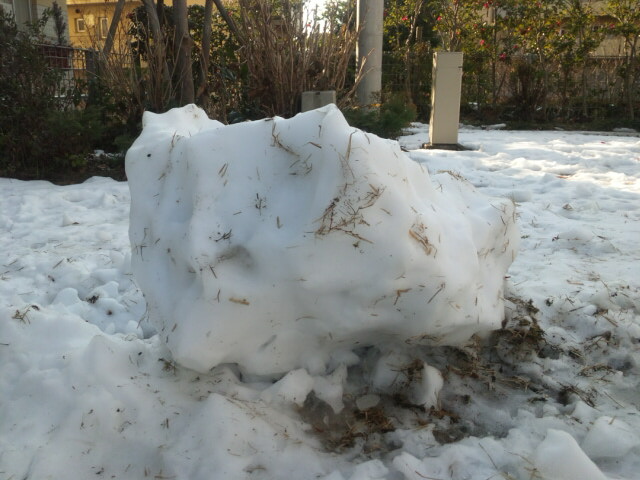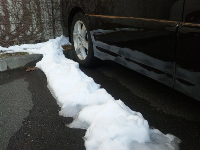 買い物に行く前にはまだ車の横に残ってた駐車場の雪は、